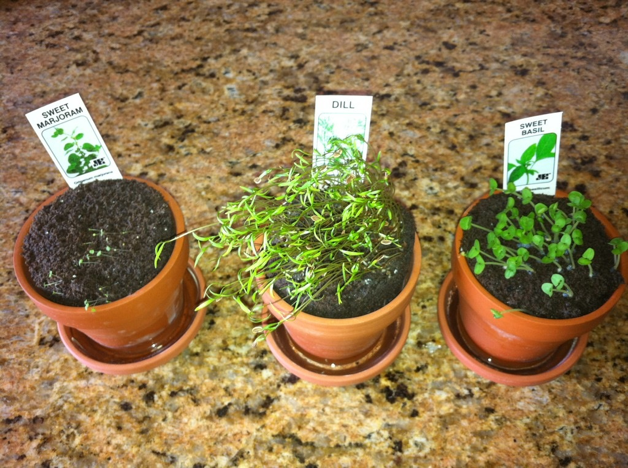Our herbs, planted just a week ago, are doing well. The dill is in the lead, although the basil was the first to sprout. The sweet marjoram is far behind. The dill, about two inches tall, was really leaning toward the light; Dani turned it and in less than an hour it had bent back the other way.